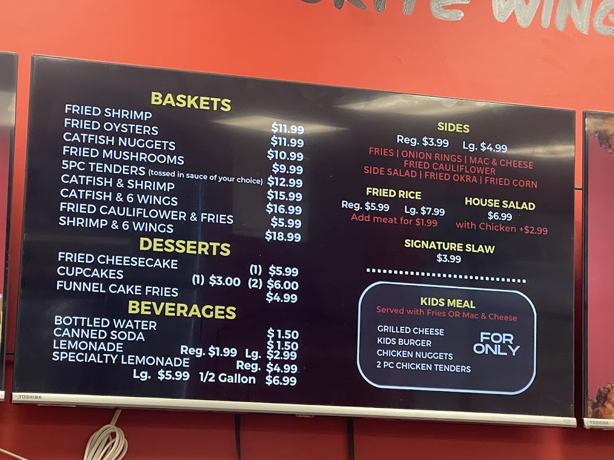 Catfish nuggets & 5 chicken wings. Choose side: fries to salad. Over 25 sauce options, including spicy, sweet, and savory.