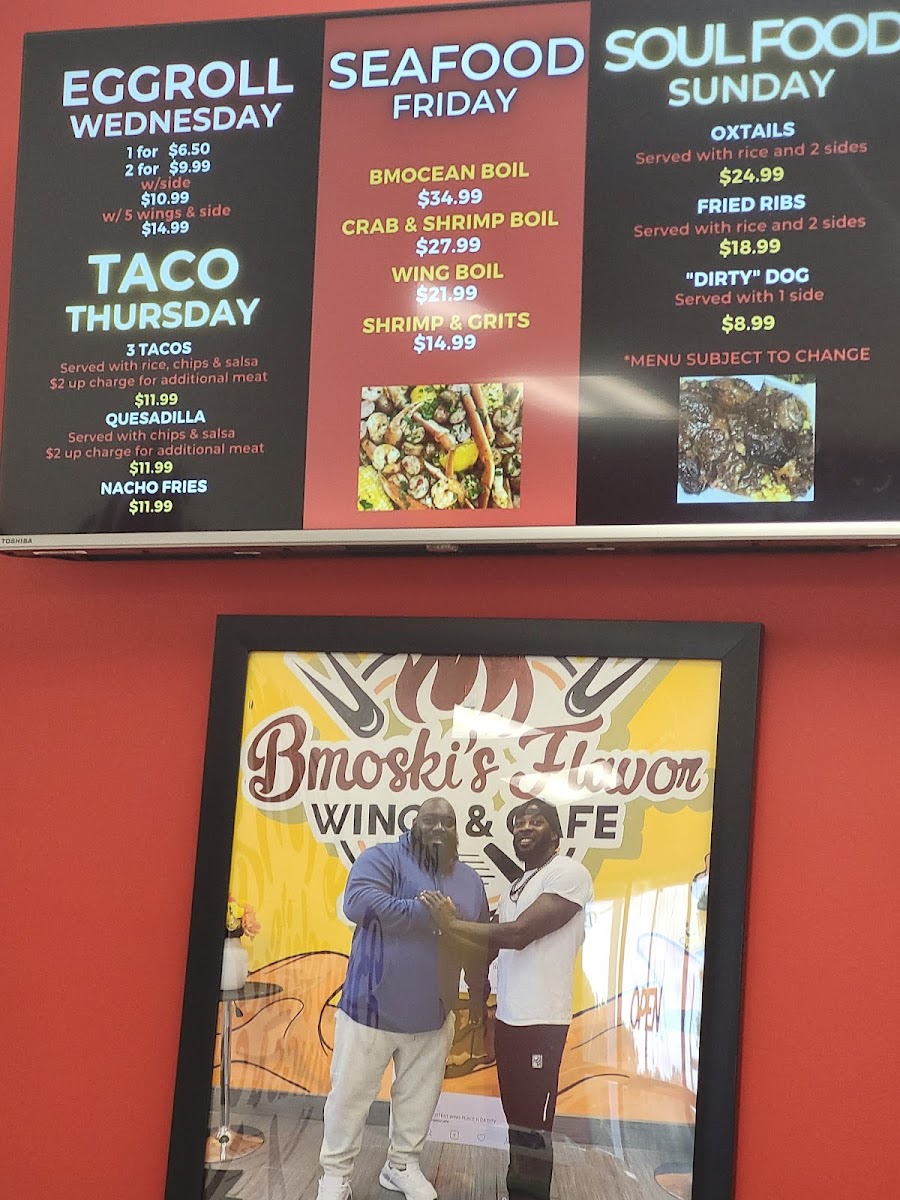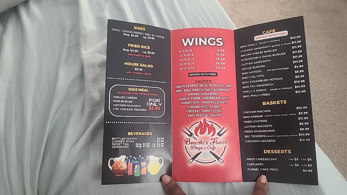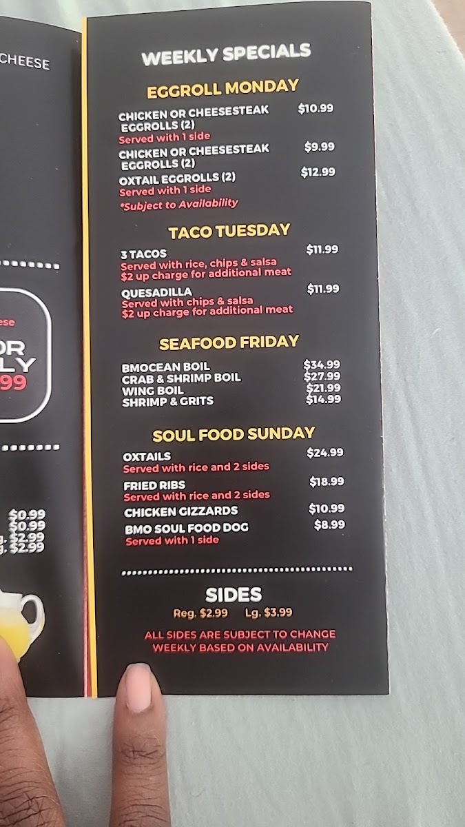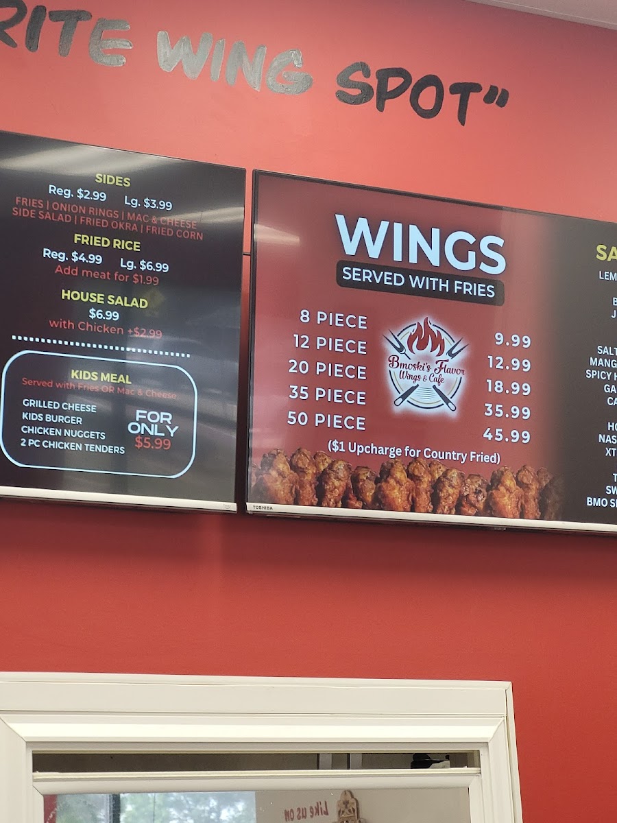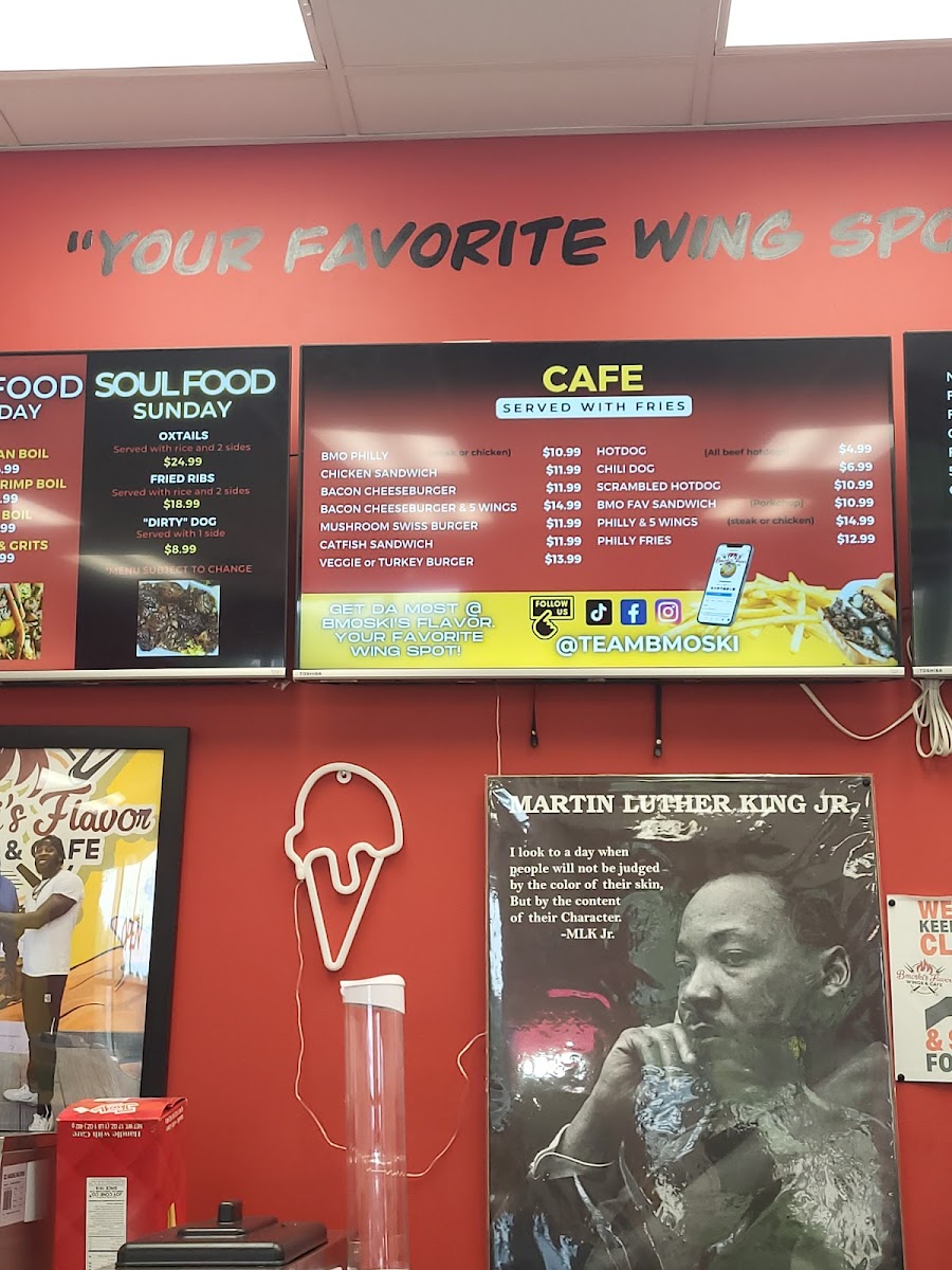 BMO shrimp paired with 5 chicken wings. Choose between fries, rice, okra, cauliflower, or salad. Over 25 sauce options including varieties of lemon pepper, BBQ, and honey flavors.