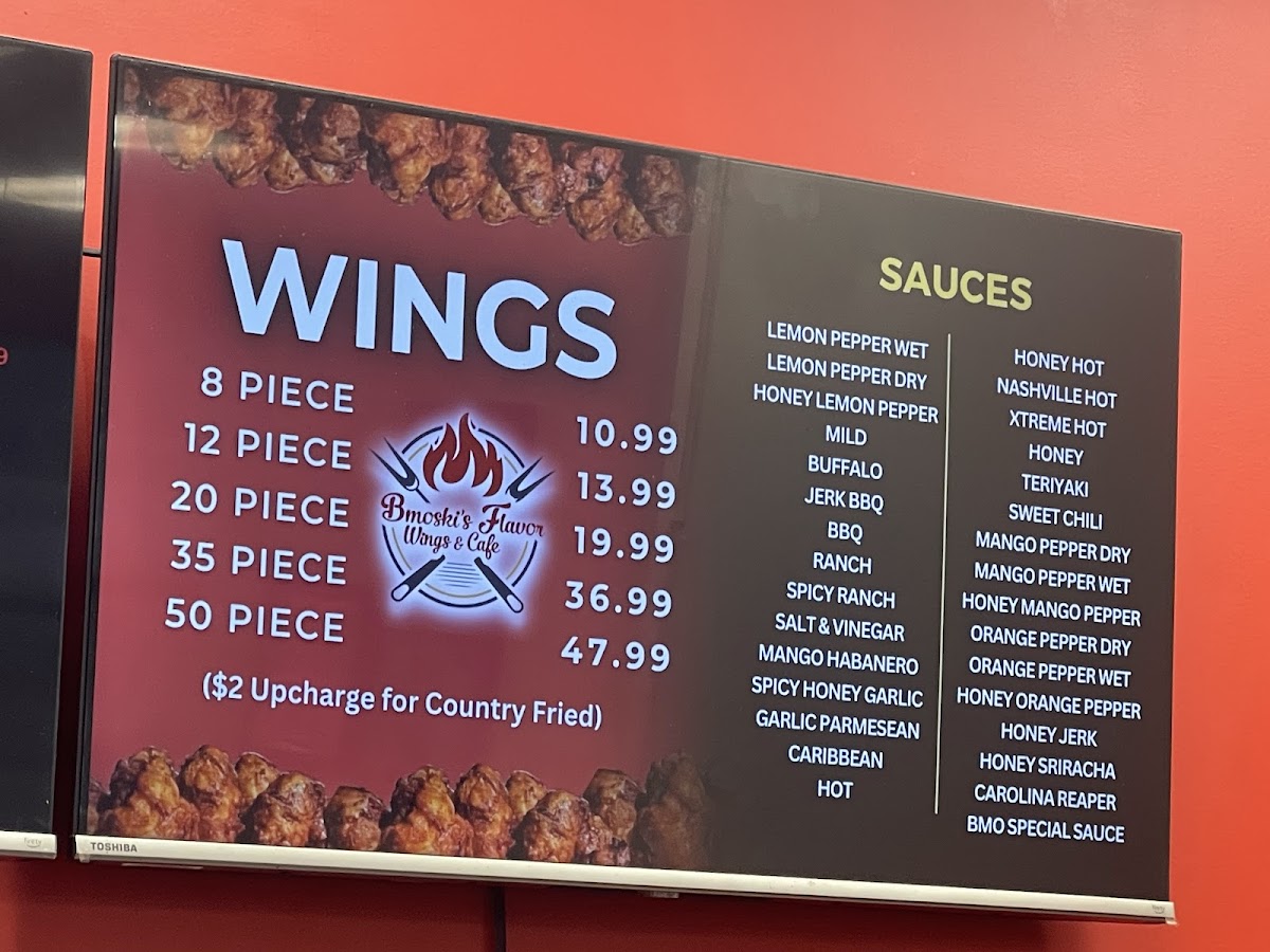 6 piece chicken wings with a choice of side: fries, fried rice, okra, cauliflower, or salad. Sauce options include a range from mild to reaper, with special flavors like honey sriracha and bmo special lemon pepper.