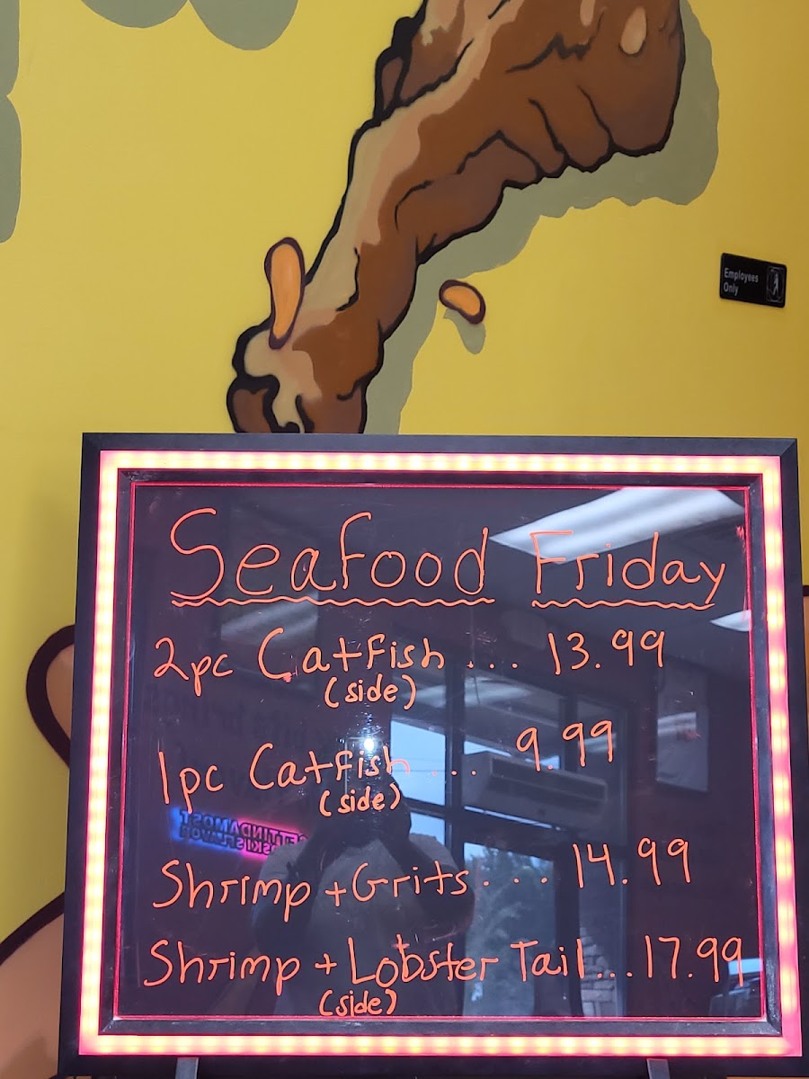 Breaded catfish paired with your choice of fries, fried rice, okra, cauliflower, or salad.
